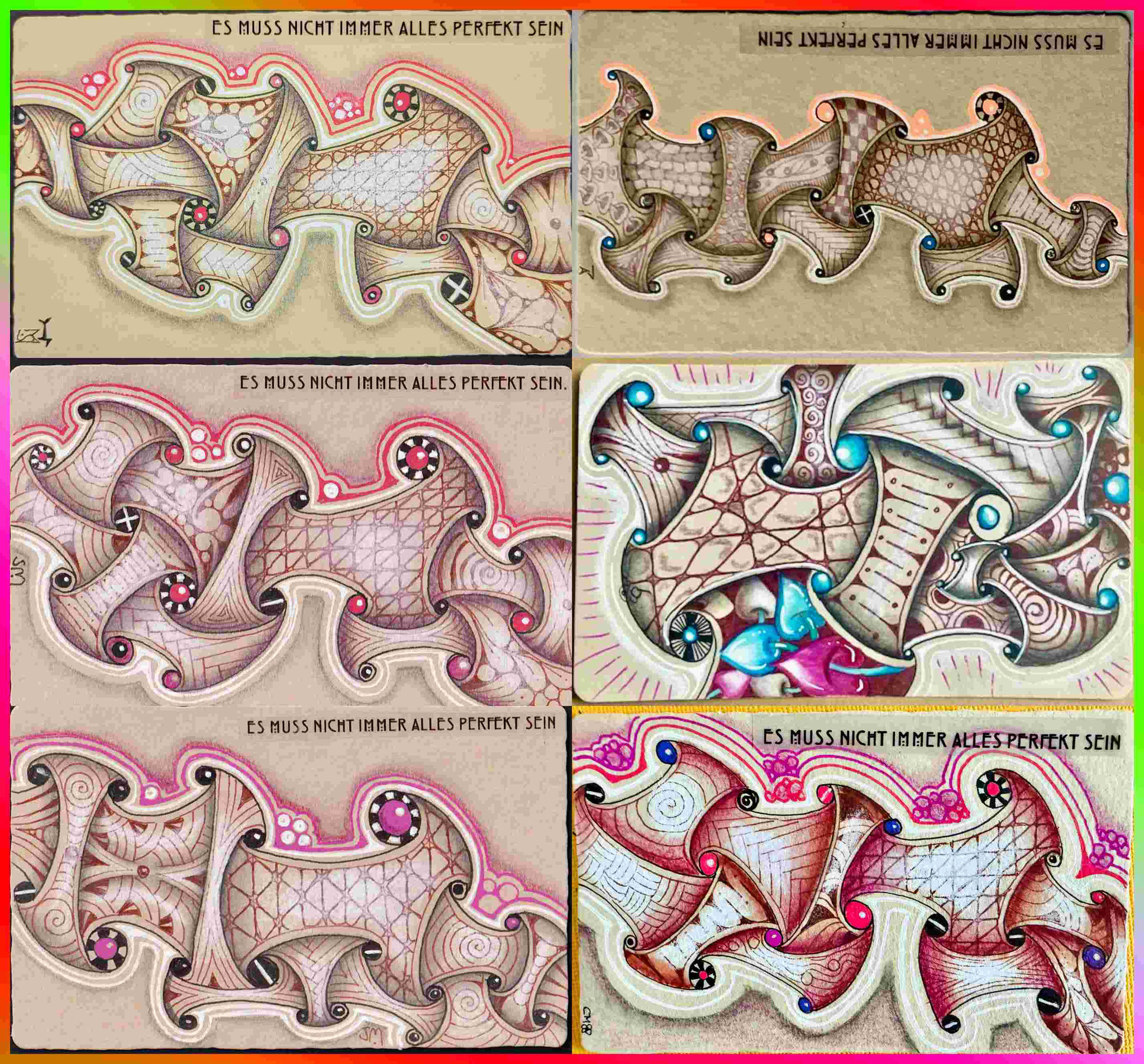 Das zweite Projekt haben wir auf einer Renaissance Kachel im Phi- Format (Goldener Schnitt) gestaltet. Es stand unter dem Motto "Es muss nicht immer alles perfekt sein". Der Spruch durfte auch mit auf die Kacheln! Aber schaut selbst- auch "Crazy Huggins" ist perfekt - besonders wenn es als Retikulum (Raster) für weitere Muster genutzt wird. Ich bin sehr glücklich über all die schönen Kacheln!